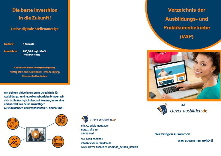Das Verzeichnis für Ausbildungs- und Praktikumsbetriebe (VAP) auf clever-ausbilden.de ermöglicht dir die Vorstellung deines Betriebes in nur wenigen Sekunden.
